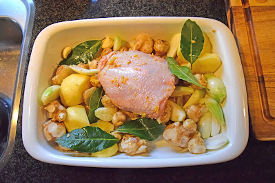 Men vi bruger ikke perlehøne, men en almindelig høne. Og masser af hvidløg og skalotteløg, kartofler og jordskokker og laurbærblade. Det hele vendes i fish sauce, olivenolie, salt og peber. Kød og grøntsager ligger i et enkelt lag i ovnen ved 180. Kødet tages ud af ovnen, når det er gennemstegt, og resten bages videre, til det er meget mørt.